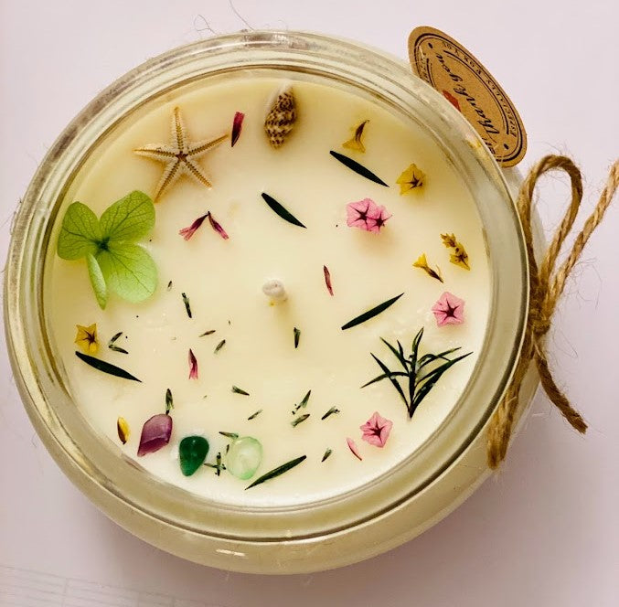 Enhance your personalized candle with natural dried flowers, fruits, herbs and small natural crystal stones.